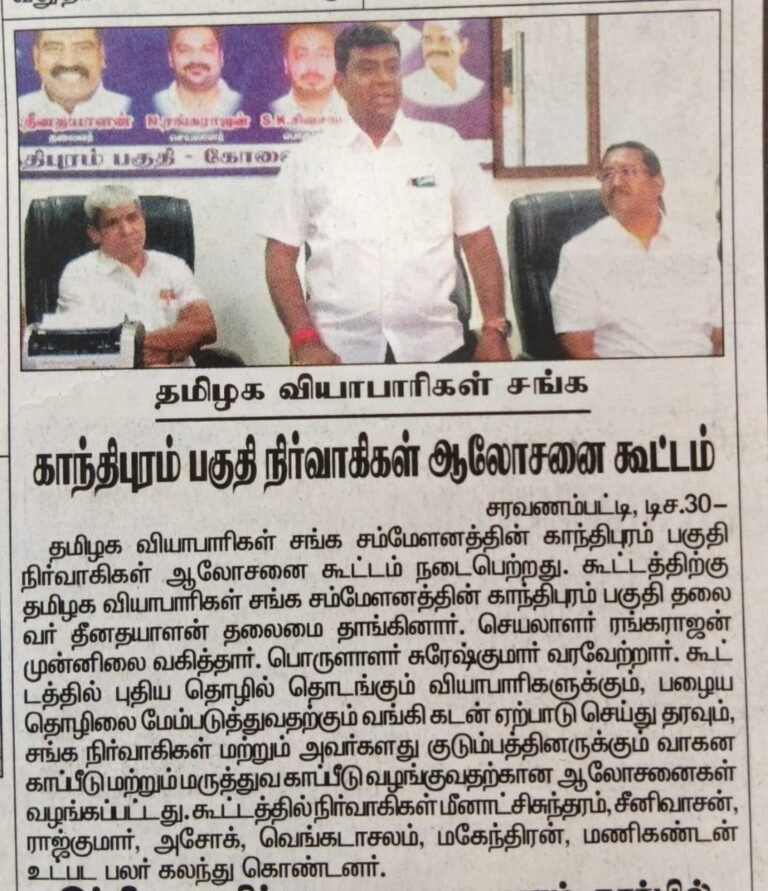 தமிழக வியாபாரிகள் சம்மேளனத்தின் ஏற்பாட்டில் வியாபாரிகள் குறை ஏற்ப மற்றும் குறை தீர்க்கும் நிகழ்வினை தலைமையிலாக நடத்தியவர் மாநில தலைவர் திரு. எஸ். எம். முருகன் அவர்கள். முன்னிலை வகித்தோர் காந்திபுரம் தலைவர் திரு. தீனதயாளன் அவர்கள். சிறப்பு விருந்தினராக பல காவல் துறை ஆய்வாளர்கள் கலந்து கொண்டனர். இந்நிகழ்வு கோவை மாவட்ட காவல் துறை கண்காணிப்பாளர் உயர்திரு பாலகிருஷ்ணன் IPS அவர்களின் தலைமையில் நடைபெற்றது.